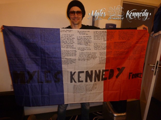 November 12th. 8.56am. Time for me to leave home to get my train to Paris. My bag is heavy with things I want to give to Myles Kennedy, as a flag full of messages from the fans. Arrived in Paris, I leave my bags and get something to eat. Can’t come to Paris without eating a burger at Hard Rock Cafe. We asked them to put some Slash on, obviously. Arrived at le Zénith around 2pm. Already many people waiting outside. It’s always great to meet some friends and fans on the queue! VIP tickets were available, to get you in half an hour earlier, which means around 5.30pm. French organisation sucks : VIP got in the room only a few minutes before the rest of the crowd. We’re sitting for that night, trying to keep some strength for the gig on the night after! Opening band is Monster Truck. They got on stage at 7.30pm. Their set was pretty cool, but they didn’t really fit with Slash & The Conspirators . 35 minutes later, it’s time to change the stage for our guys. The crowd cannot wait to see the famous guitar hero getting on stage. And this will happen at 8.30pm. The intro starts, the band gets on stage, and kick the whole crowd’s ass. They were on fire, jumping around the stage. We’ve been surprised to see Mean Bone back on the setlist, which pleased me cause it’s one of my favorite songs live. They also played Rocket Queen for 22 minutes. 2 hours later, the show ends, the band leaves the stage, knowing that they’ll be back really soon.